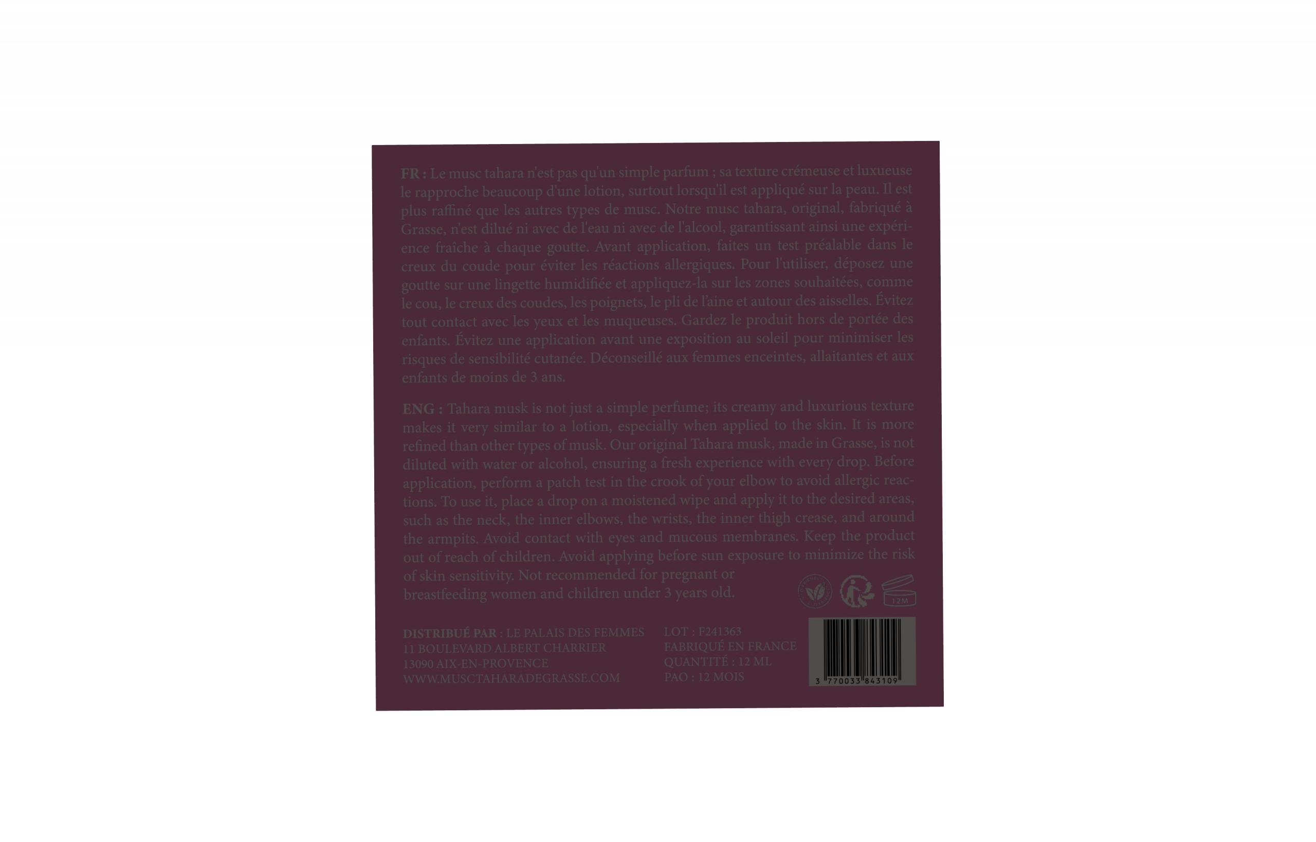 Musc Tahara PUR Classique EN EXTRAIT DE PARFUM non dilué, ni avec de l’eau ni avec de l’alcool. Fabrication Grassoise .